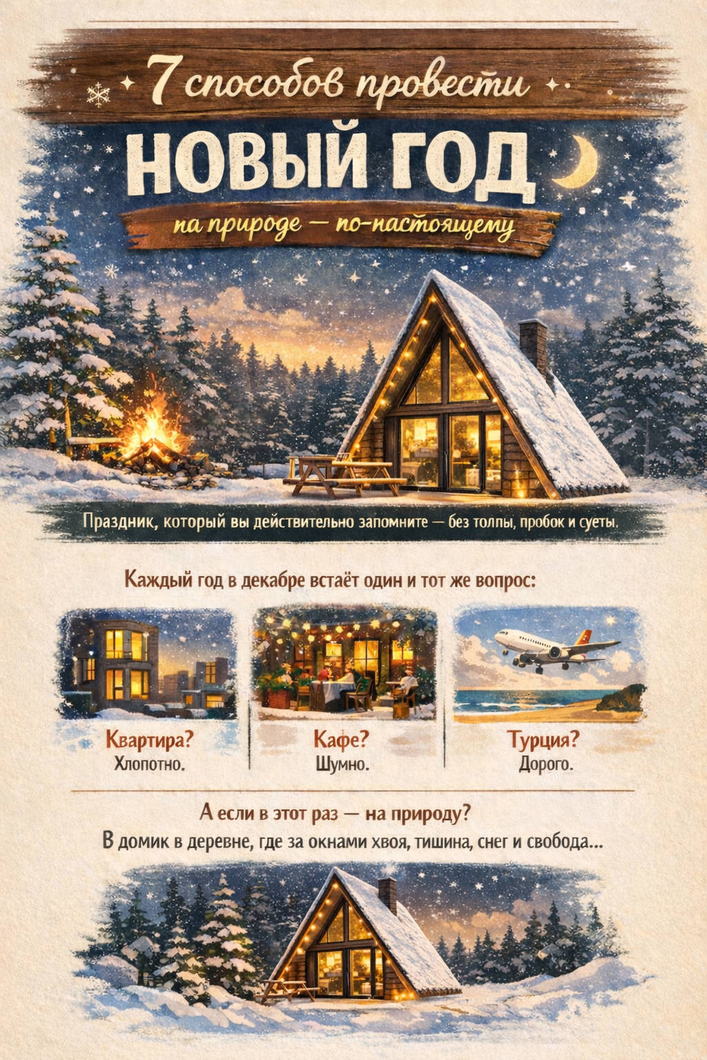 Забудь про хлопушки за стенкой и соседей с колонкой. За городом шумит только лес. Снег под ногами, хруст в тишине, пар изо рта и ясное небо со звёздами. Ты начинаешь слышать не только природу — но и себя.